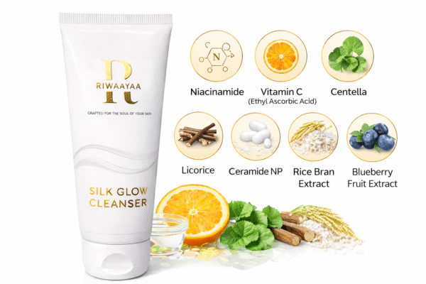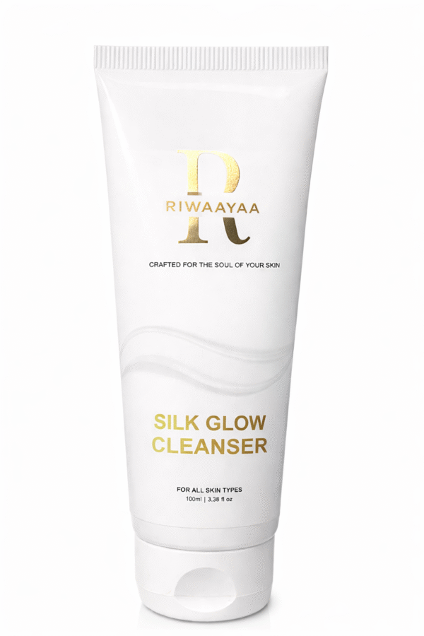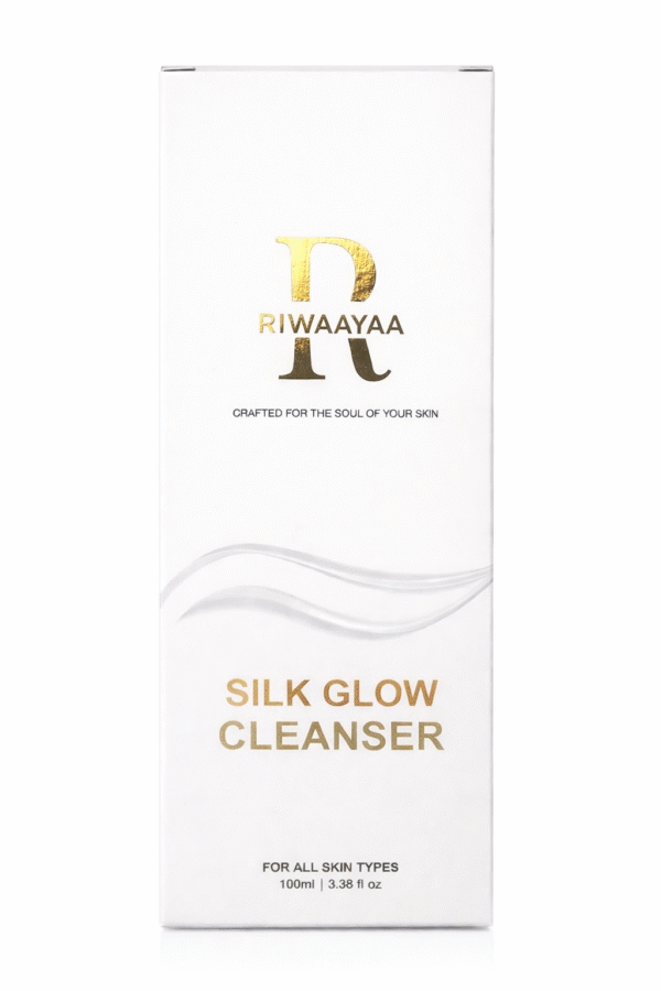 RIWAAYAA Silk Glow Cleanser is a gentle daily face cleanser that cleanses, brightens, and hydrates the skin. Powered with Niacinamide, Vitamin C, Ceramide NP, and botanical extracts, Rice bran extract water, it removes impurities without stripping moisture, leaving skin soft, fresh, and naturally glowing